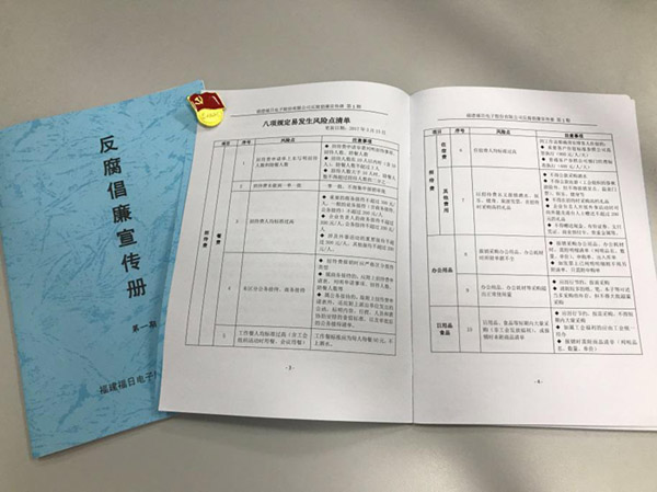 結合“兩學一做”學習教育常態化製度化,2017年上半年以來,福日電子黨委、紀委多形式多種渠道深入開展全麵從嚴治黨教育。一是組織收看專題教育片《永遠在路上》,利用鮮活的案例教育和引導廣大黨員防微杜漸、警鍾長鳴;二(er)是(shi)利(li)用(yong)公(gong)司(si)廉(lian)潔(jie)教(jiao)育(yu)微(wei)信(xin)群(qun)平(ping)台(tai),不(bu)定(ding)期(qi)向(xiang)企(qi)業(ye)中(zhong)層(ceng)以(yi)上(shang)領(ling)導(dao)幹(gan)部(bu)及(ji)黨(dang)員(yuan)推(tui)送(song)教(jiao)育(yu)警(jing)示(shi)文(wen)章(zhang),開(kai)展(zhan)微(wei)黨(dang)課(ke)教(jiao)育(yu),提(ti)醒(xing)督(du)促(cu)領(ling)導(dao)幹(gan)部(bu)及(ji)黨(dang)員(yuan)以(yi)身(shen)作(zuo)則(ze),嚴(yan)守(shou)“廉潔關”;三是在重要節假日等關鍵節點下發通知文件,持續重申中央八項規定精神和廉潔從業等有關紀律要求,及時開展自查自糾,廉潔過節;四是編印《反腐倡廉宣傳冊》,涵蓋遵守八項規定風險點、廉潔從業應知應會知識及行為規範、違紀案件警示錄等內容,使廉潔教育知識隨時可學可查,讓反腐倡廉真正融入廣大黨員、幹部、職工日常工作、生活。