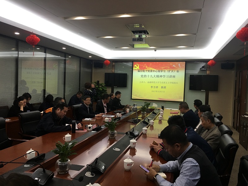 2017年12月7日下午,福日電子以黨委中心組學習(擴大)會的形式舉辦黨的十九大精神學習講座,特邀福建師範大學馬克思主義學院院長、博士生導師李方祥教授作了題為《新思想引領新時代,新使命開啟新征程》的十九大精神輔導,公司黨委委員、成員企業、事業部副總以上領導、本部助理以上管理人員以及機關支部全體黨員近40人參會。