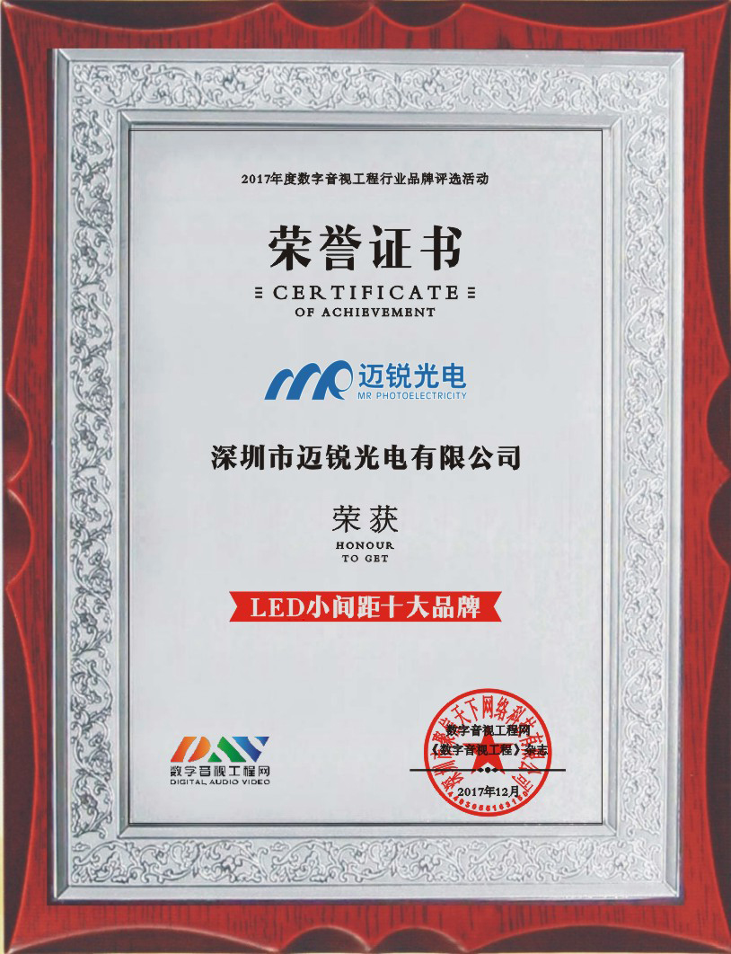經設計院、經銷商、工程商、終端客戶等網絡無記名投票及數字音視工程行業的權威專家綜合評定,2017年12月,2017年度數字音視工程行業品牌評選活動圓滿結束,福日電子控股企業深圳市邁銳光電有限公司榮獲2017年度LED小間距十大品牌。本次活動由中國數字音視工程網、《數字音視工程》雜誌主辦。