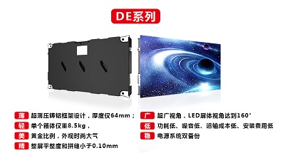 銳尚係列顯示屏每塊模組均擁有獨立主控芯片,能夠自動讀取和記錄模組的工作數據,同時具有錯誤偵測和定位等功能。小間距DE係列顯示屏設計輕薄,有效減少屏體安裝空間。