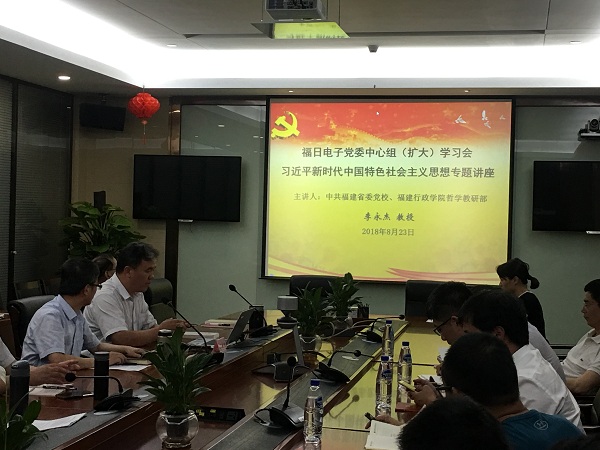 2018年8月23日下午,為進一步興起習近平新時代中國特色社會主義思想“大學習”熱潮,福日電子黨委中心組舉辦(擴大)學習會,特邀中共福建省委黨校、福建行政學院哲學教研部李永傑教授作題為《習近平新時代中國特色社會主義思想解讀》專題講座。公司黨委委員、各成員企業、事業部黨支部書記、副總以上領導、本部助理以上管理人員以及機關支部全體黨員近40人聽取了講座。