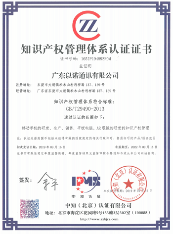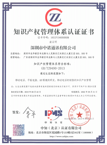 2019年9月,福日電子成員企業深圳市中諾通訊有限公司、廣東以諾通訊有限公司先後通過知識產權管理體係認證,進一步推進公司知識產權管理工作規範化、係統化、科學化,提升企業核心競爭力。
