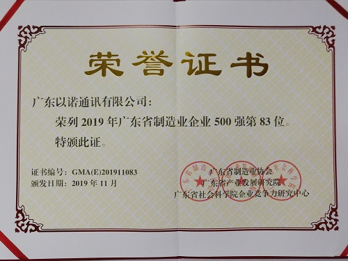 2019年11月13日,由廣東省製造業協會、廣東省產業發展研究院、廣東省社會科學院企業競爭力研究中心共同主辦的2019廣東省製造業發展年會暨廣東製造業500強企業峰會在廣州隆重舉行,會上發布了2019年廣東省製造業500強企業研究報告,福日電子二級控股子公司廣東以諾通訊有限公司榮列2019年廣東省製造業企業500強第83位。