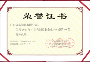 2020年11月26日,由廣東省製造業協會、廣東省發展和改革研究院、暨南大學產業經濟研究院主辦的“2020廣東省製造業發展年會暨廣東省製造業500強企業峰會”在中山市舉行。本屆年會以“推動製造業高質量發展——擁抱5G+工業互聯網、搶抓國內大循環機遇”為主題,會上發布了2020年廣東省製造業500強企業研究報告,福日電子二級控股子公司廣東以諾通訊有限公司榮列2020年廣東省製造業企業500強第98位。