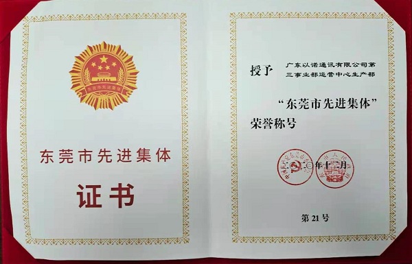 2020年12月25日,2020年東莞市勞動模範、先進工作者和先進集體表彰大會在該市會議大廈舉行,大會表彰了全市54名勞模、6名先進工作者以及30個先進集體,福日電子二級控股子公司廣東以諾通訊有限公司第三事業部運營中心生產部被授予“東莞市先進集體”榮譽稱號。該部門通過成立員工關愛委員會、製定“傑出工匠”“百夫長”方案、落實疫情防控工作、設立員工問題反饋信箱、組織各類文體活動等舉措,推動部門各項工作順利開展,為公司做強做優做大通訊產業貢獻力量。