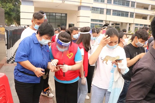 從早上8點半起,周邊企業的員工們就分批來到等待區域。“請往這裏走。”“麻煩出示一下行程碼。”一抹抹白色與紅色交織的身影,正在進行現場分流引導、幫忙查詢行程,他們正是由邁銳光電黨支部黨員和入黨積極分子組成的7人誌願者隊伍。在他們的助力下,現場每個步驟環環相扣、有條不紊,在當日16時即完成全部6500餘人的核酸檢測工作,讓黨旗在防疫一線高高飄揚。