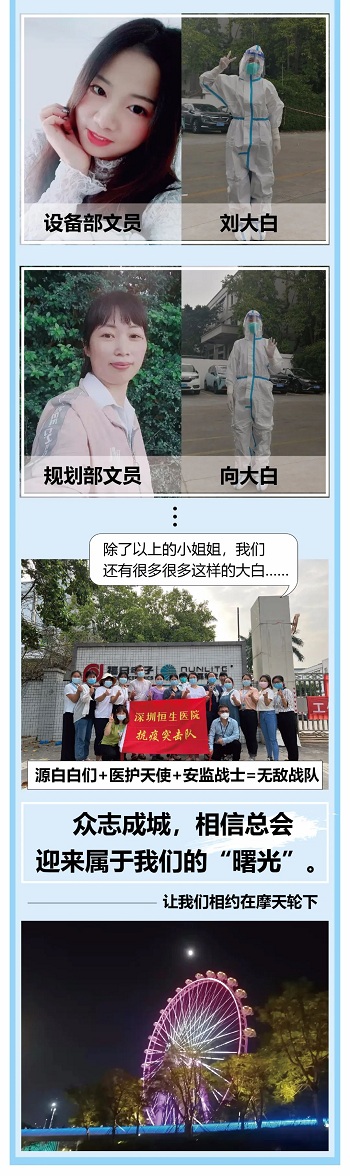 無獨有偶,源磊科技也用“微光聚愛”。從2月26日至3月22日,在其中的13個日子裏,源磊科技的16名誌願者“逆行”奔赴防疫前線,配合當地有關部門開展消毒、核酸檢測等工作。無論驕陽似火,亦或刮風下雨,這群“大白”們都堅守在誌願服務一線。正如他們所說,疫情當前,他們從不缺席,迎接美好四月天是他們堅持的動力。