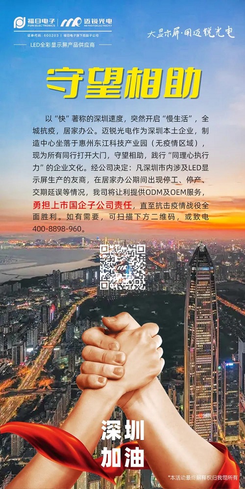因為疫情,以“快”著稱的深圳速度,也突然開啟“慢”生活。3月15日,邁銳光電發布信息,表示該公司製造中心坐落在無疫情區域的惠州東江科技產業園,如深州市內涉及LED顯示屏生產的友商,在居家辦公期間出現停工、停產、交期延誤等情況,該公司將讓利提供ODM及OEM服務,直至抗擊疫情戰役全麵勝利,充分展現其“同理心執行力”的企業文化和“守望相助”的使命責任。