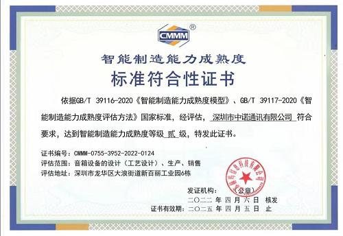 2021年9月-10月,由電子標準院授權江蘇赫瑪信息科技有限公司組建團隊,基於GB/T 39116-2020《智能製造能力成熟度模型》、GB/T 39117-2020《智能製造能力成熟度評估方法》國家標準,對中諾通訊新百麗工業園從工廠設計、產品研發、工藝設計、計劃與調度、生產作業、倉儲配送、質量管控、設備管理、安全管控、能源管理、環保管理等20個能力子域的智能製造能力成熟度,通過人員交流、現場巡視、係統查看等方法進行評估,認定該公司智能製造能力成熟度達到貳級水平,得到國家認可。
