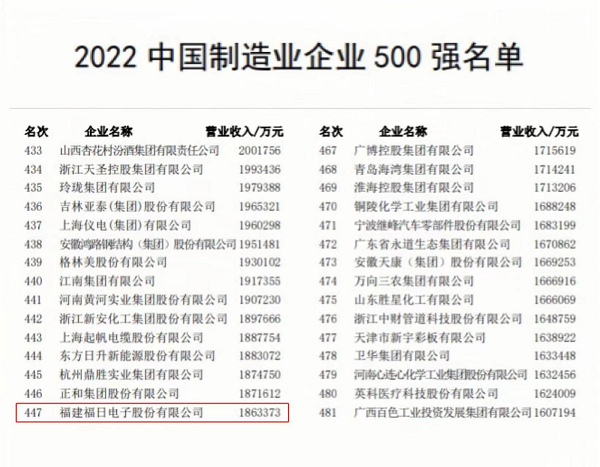 9月6日,中國企業聯合會、中國企業家協會舉行新聞發布會上,向社會發布了“2022中國企業500強”“2022中國製造業企業500強”“2022中國服務業企業500強”等各項榜單及其分析報告。其中,公司首次入圍中國製造業企業500強,位列第447位。
