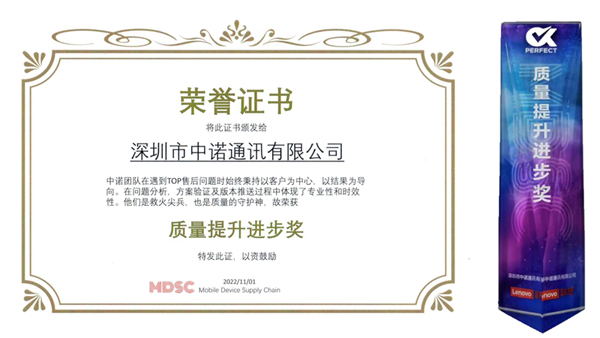 近日,2022年聯想供應商質量論壇主題分享及年度頒獎在線上拉開帷幕,福日電子成員企業深圳市中諾通訊有限公司在線上出席了此次活動。“匠家技最巧,能工事尤精”,今年中諾項目的售後返修率TCRR指標滿足目標要求並持續降低,在本次論壇中獲得多次表揚,並榮獲“聯想2022年度質量提升進步獎”。