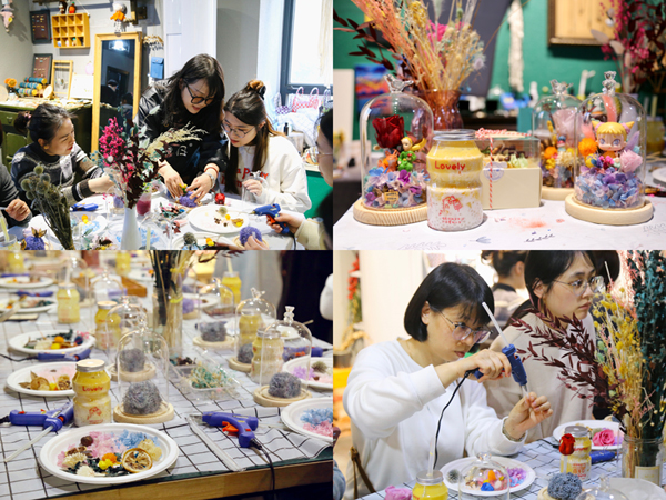活動現場,花藝師就如何安放主花、固定花瓣、插花造型等步驟和技巧等進行了詳細講解。大家選擇好心儀的花材,充分發揮創意和想象力,精心將每一朵花、每一片葉插放和鋪貼,使原本樸實無華的花托瞬間花團錦簇、生(sheng)機(ji)盎(ang)然(ran)。活(huo)動(dong)中(zhong),大(da)家(jia)你(ni)瞧(qiao)瞧(qiao)我(wo)的(de),我(wo)看(kan)看(kan)你(ni)的(de),相(xiang)互(hu)交(jiao)流(liu)搭(da)配(pei)心(xin)得(de),在(zai)歡(huan)聲(sheng)笑(xiao)語(yu)中(zhong)完(wan)成(cheng)了(le)一(yi)份(fen)份(fen)精(jing)美(mei)且(qie)獨(du)一(yi)無(wu)二(er)的(de)永(yong)生(sheng)花(hua)作(zuo)品(pin)。大(da)家(jia)手(shou)捧(peng)親(qin)手(shou)製(zhi)作(zuo)的(de)永(yong)生(sheng)花(hua)合(he)影(ying)留(liu)念(nian),定(ding)格(ge)美(mei)好(hao)瞬(shun)間(jian)。