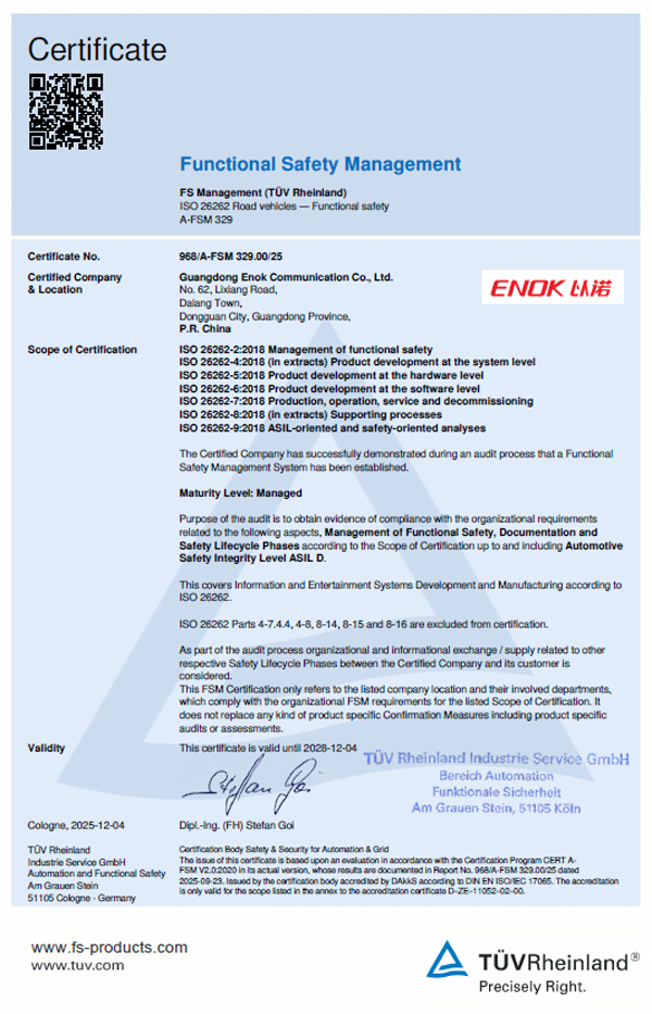 近日,國際獨立第三方檢測、檢驗和認證機構德國萊茵TÜV集團(TÜV Rheinland)正式向福日電子成員企業以諾通訊頒發ISO 26262:2018汽車功能安全管理體係認證證書。該認證確認,以諾通訊已按照汽車功能安全最高等級ASIL-D要求,建立了產品全生命周期的功能安全開發與管理流程體係,標誌著公司在汽車電子通訊領域的功能安全能力達到國際先進水平。